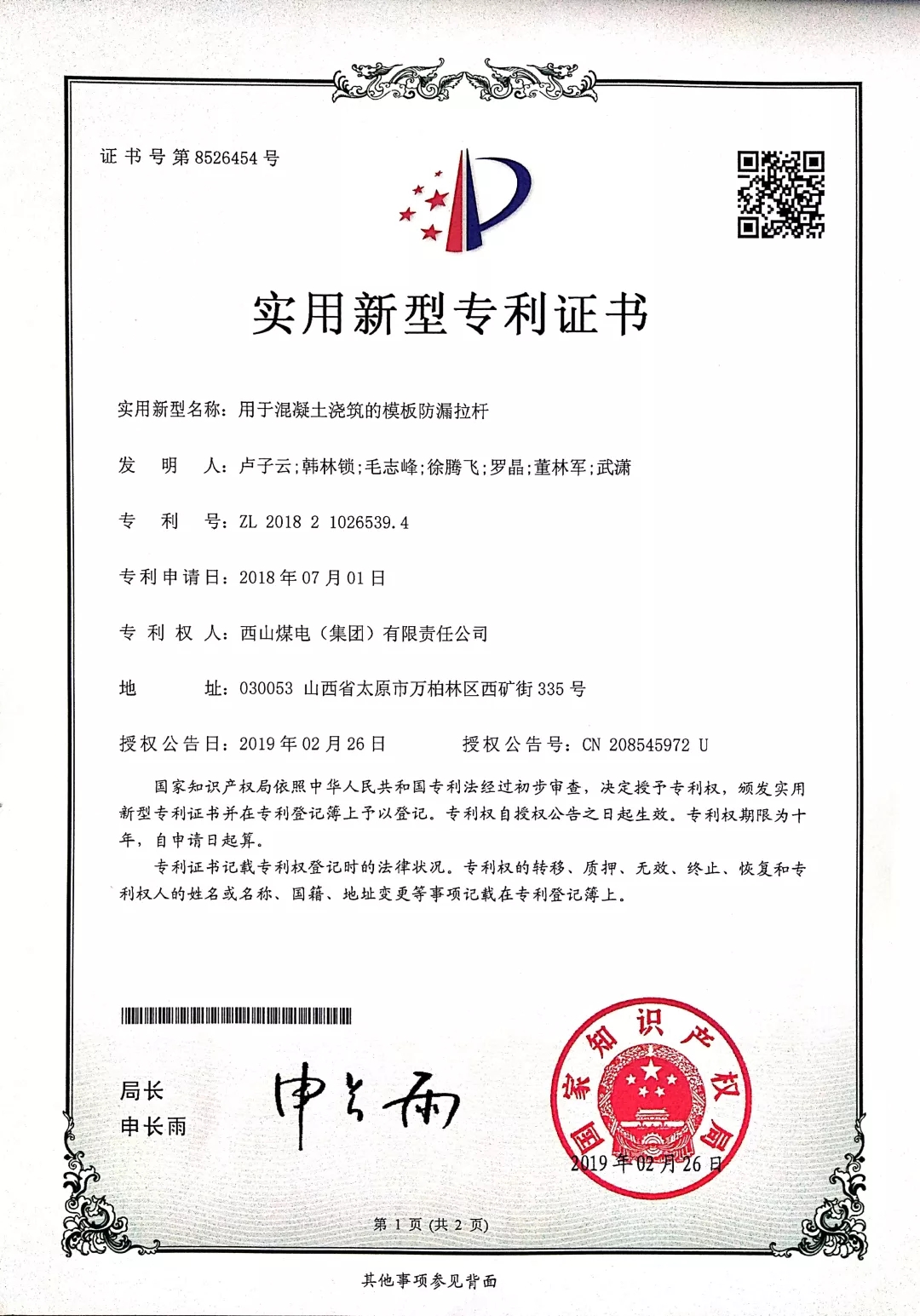 《用于混凝土浇筑的模板防漏拉杆》实用新型专利