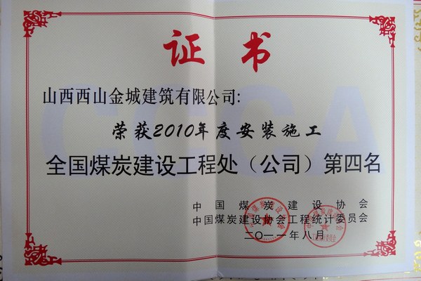 荣获2010年度安装施工全国煤炭建设工...